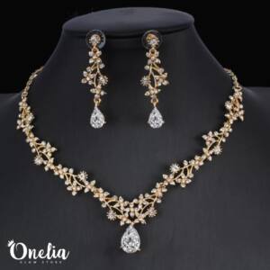 Set DIONE – Collar y aretes dorado con zirconia en color natural – Onelia