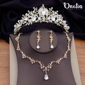 Set tiara JANE celeste + aretes y collar ADHARA – Dorado con piedras en color natural – Onelia