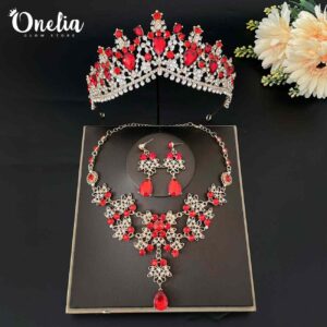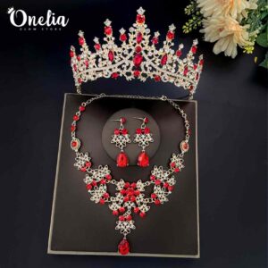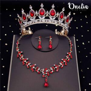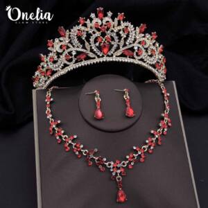 Set corona ESTEFANÍA + aretes y collar ADHARA – Dorado con piedras rojas – Onelia