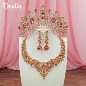 Set tiara EUGENIA + aretes y collar ADHARA – Dorado con piedras rosadas – Onelia
