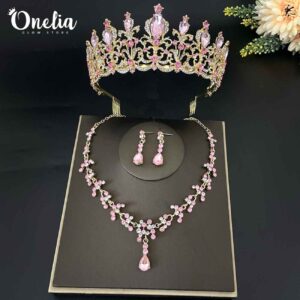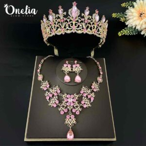 Set tiara EUGENIA + aretes y collar MAIA – Dorado con piedras rosadas – Onelia
