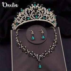 Set tiara MAGDALENA + aretes y collar ADHARA – Dorado con piedras verdes – Onelia