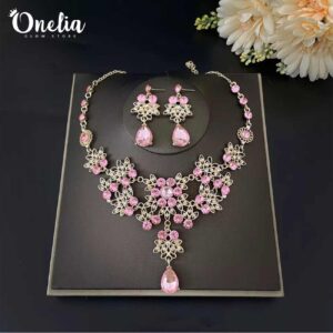 Set tiara JANE rosado + aretes y collar ADHARA – Dorado con pedrería de cristales rosadas – Onelia