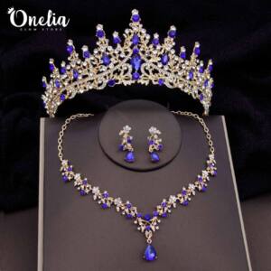 Set tiara LETIZIA + aretes y collar LYRA – Dorado con piedras azules – Onelia