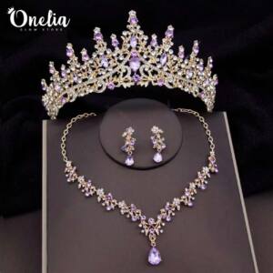 Set tiara SOFIA + aretes y collar LYRA – Dorado con piedras lilas – Onelia