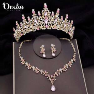 Set tiara SOFIA + aretes y collar LYRA – Dorado con piedras rosadas – Onelia