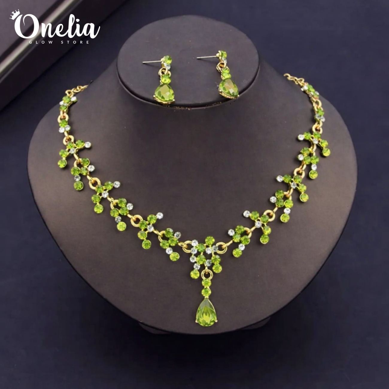 ADHARA – Set collar y aretes dorado con pedrería de cristales verde manzana - Onelia