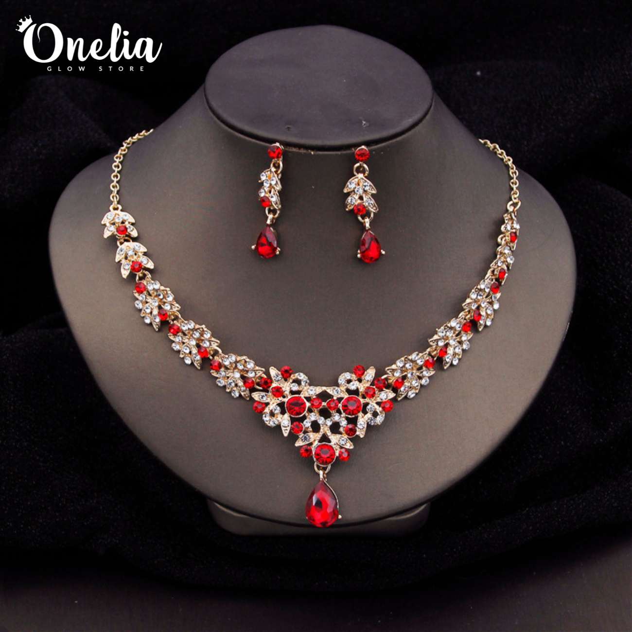 / Set CERES – Collar y aretes dorado con piedras rojas – Onelia