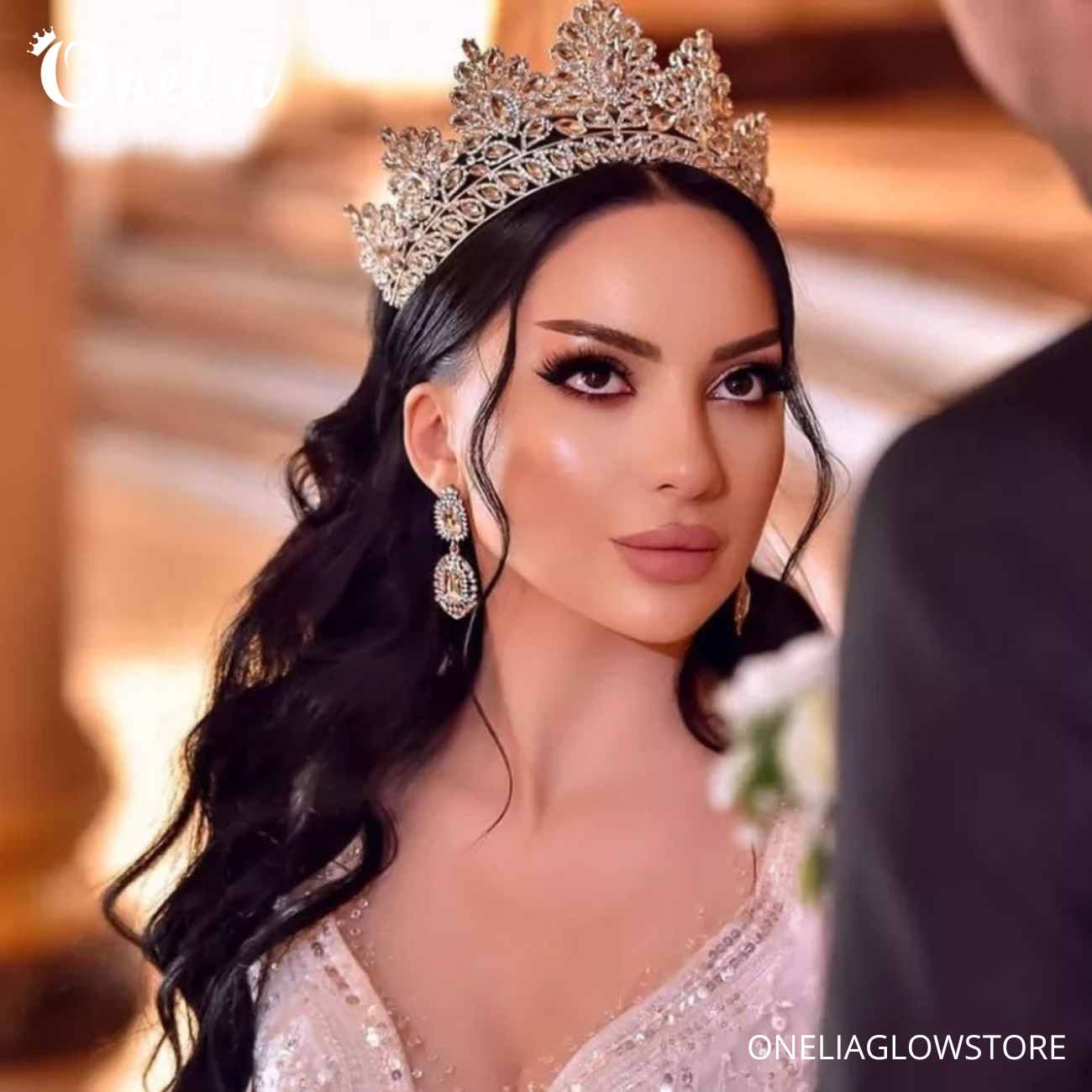 ANGELINA – Tiara dorada con piedras dorado champagne 8cm alto – Onelia