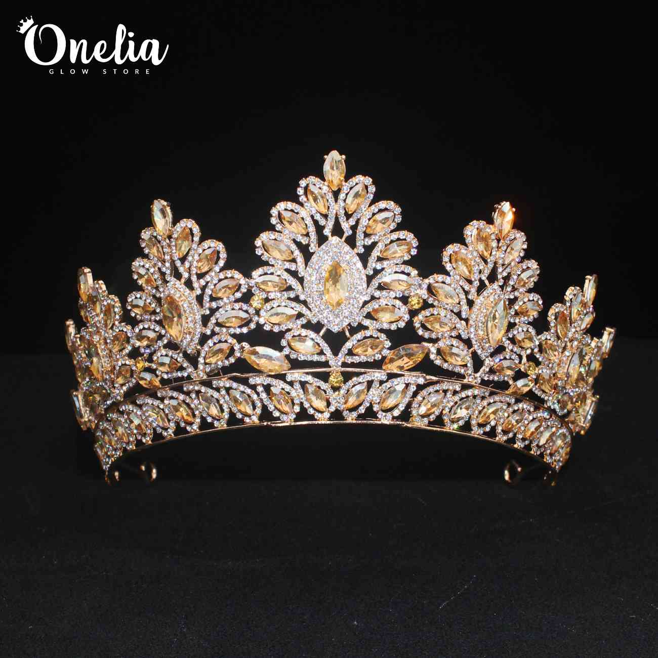 ANGELINA – Tiara dorada con piedras dorado champagne 8cm alto – Onelia quantity