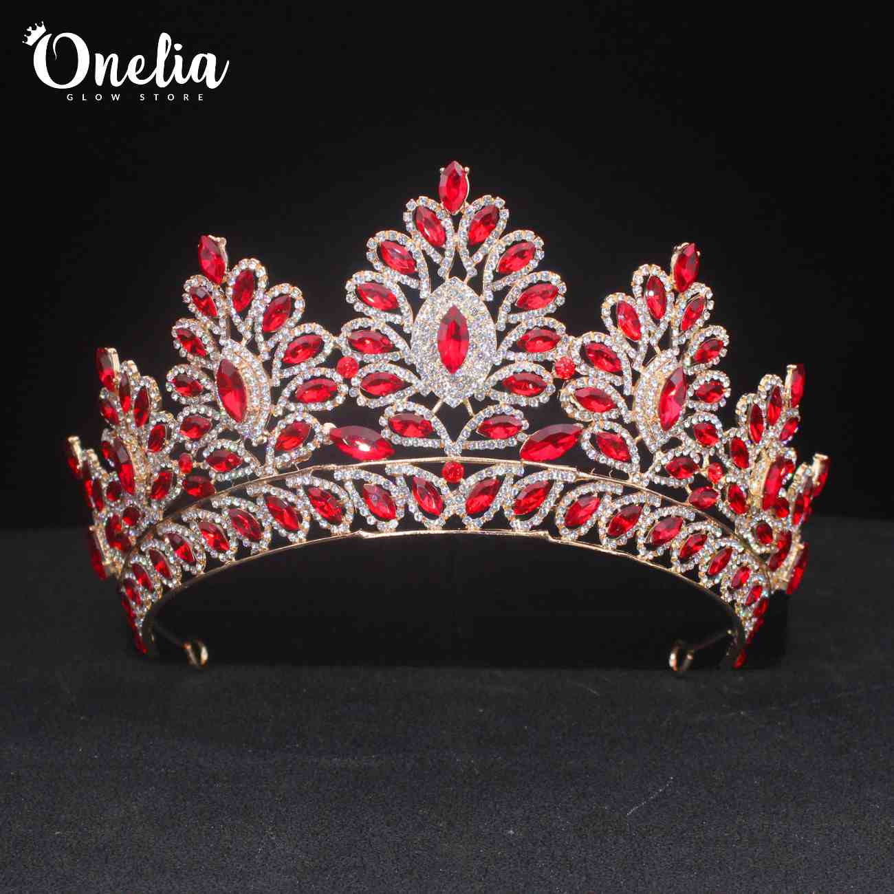 ANGELINA – Tiara dorada con piedras rojas 8cm alto - Onelia