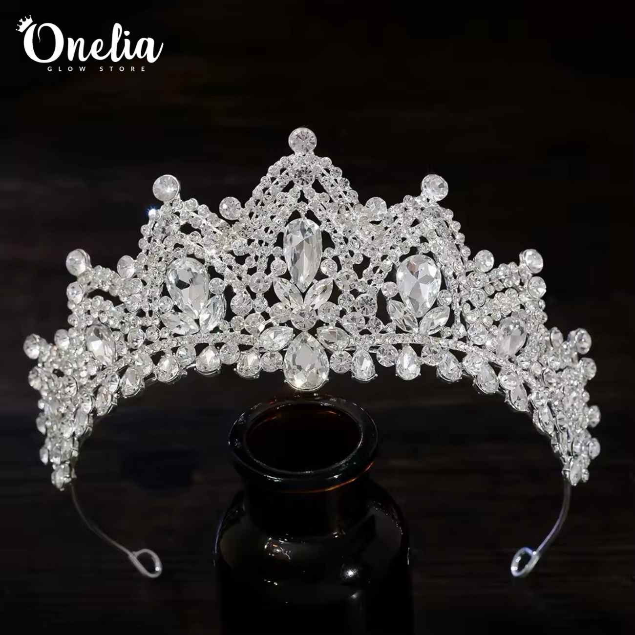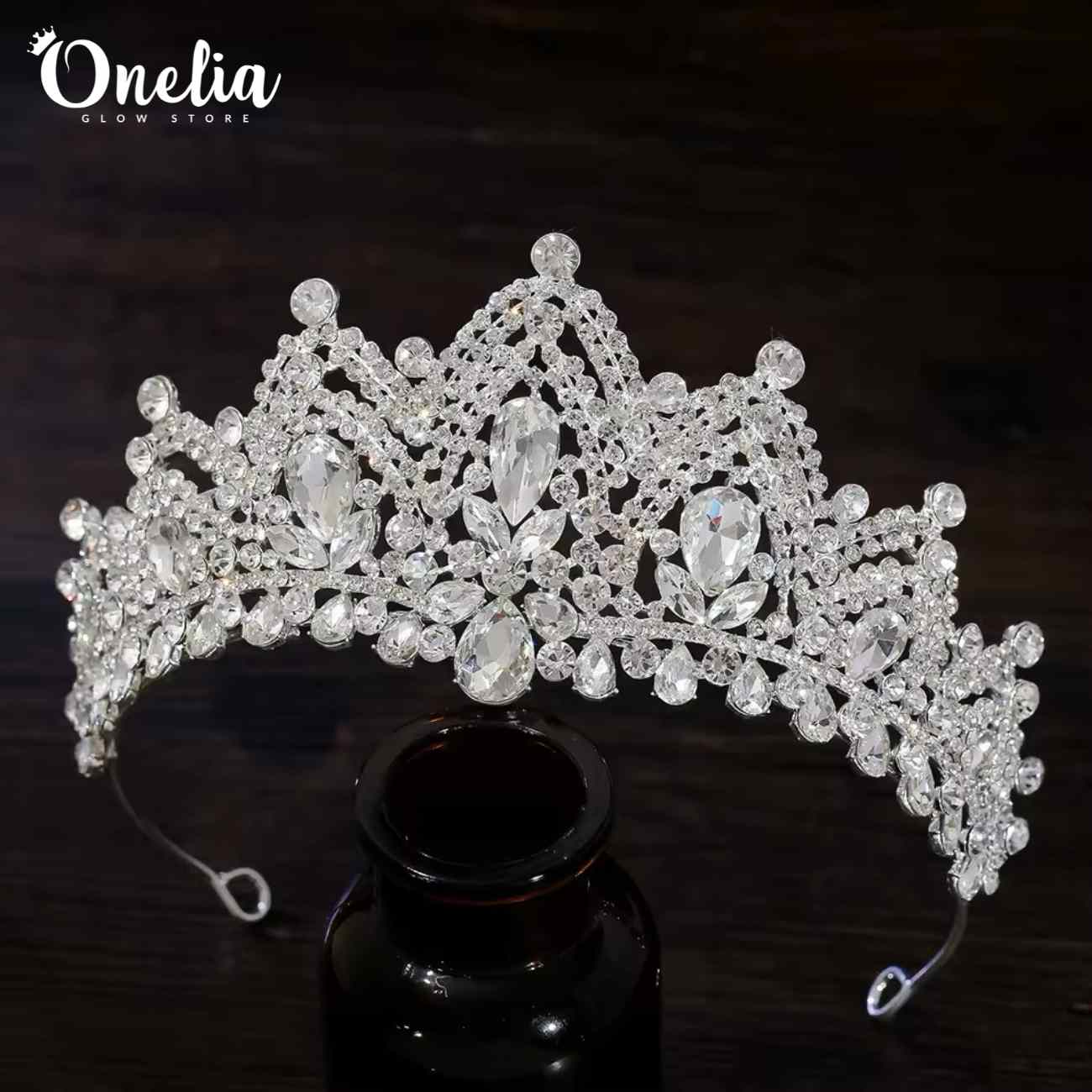 / NATALIA – Tiara plateada con pedrería de cristales en color natural 7.8cm alto – Onelia