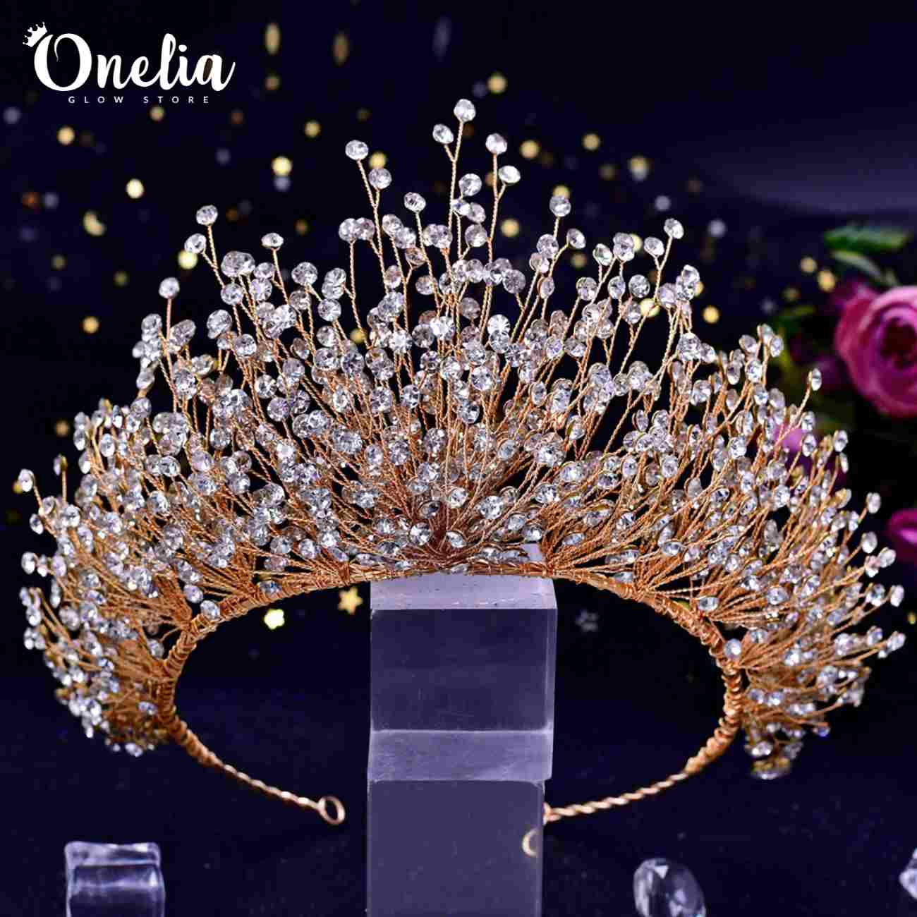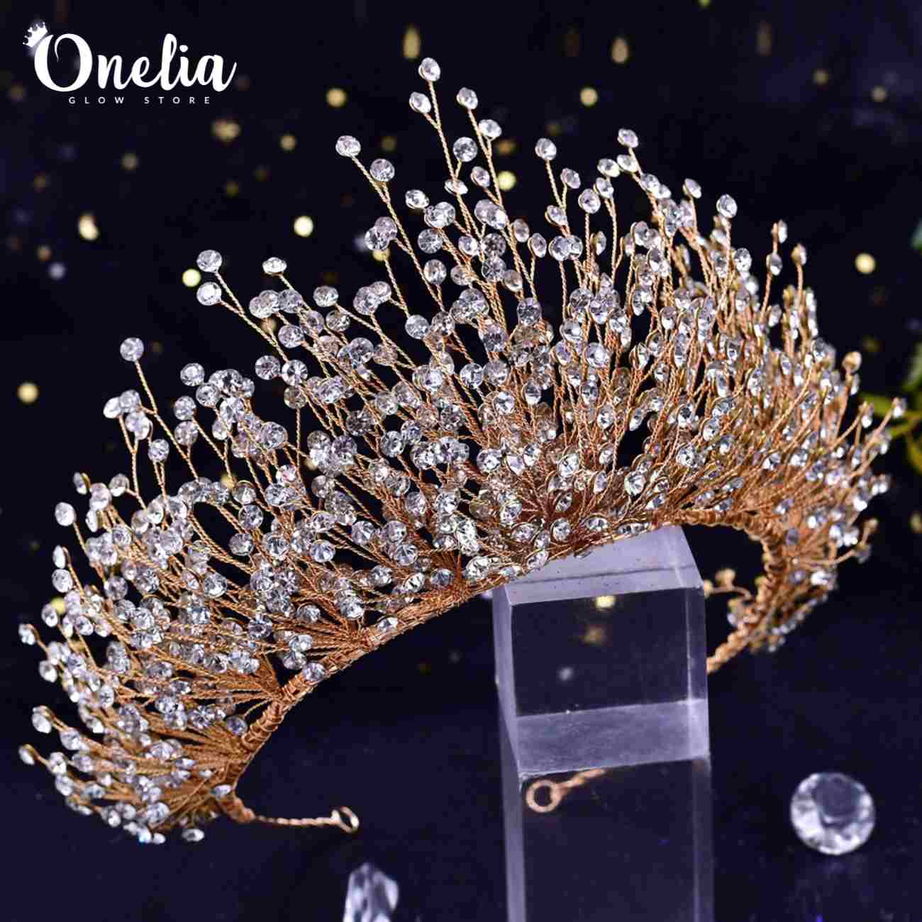 / SCARLETT – Tiara flexible dorada con full pedrería de cristales en color natural – Onelia