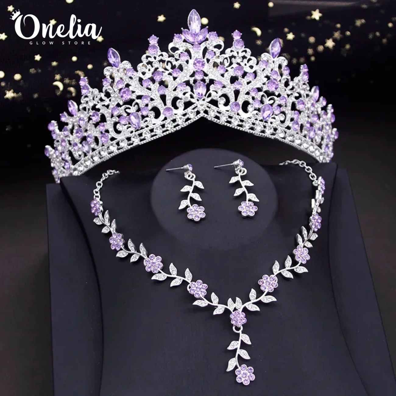 / Set tiara LEONOR + aretes y collar CARINA – Plateado con piedras lilas – Onelia