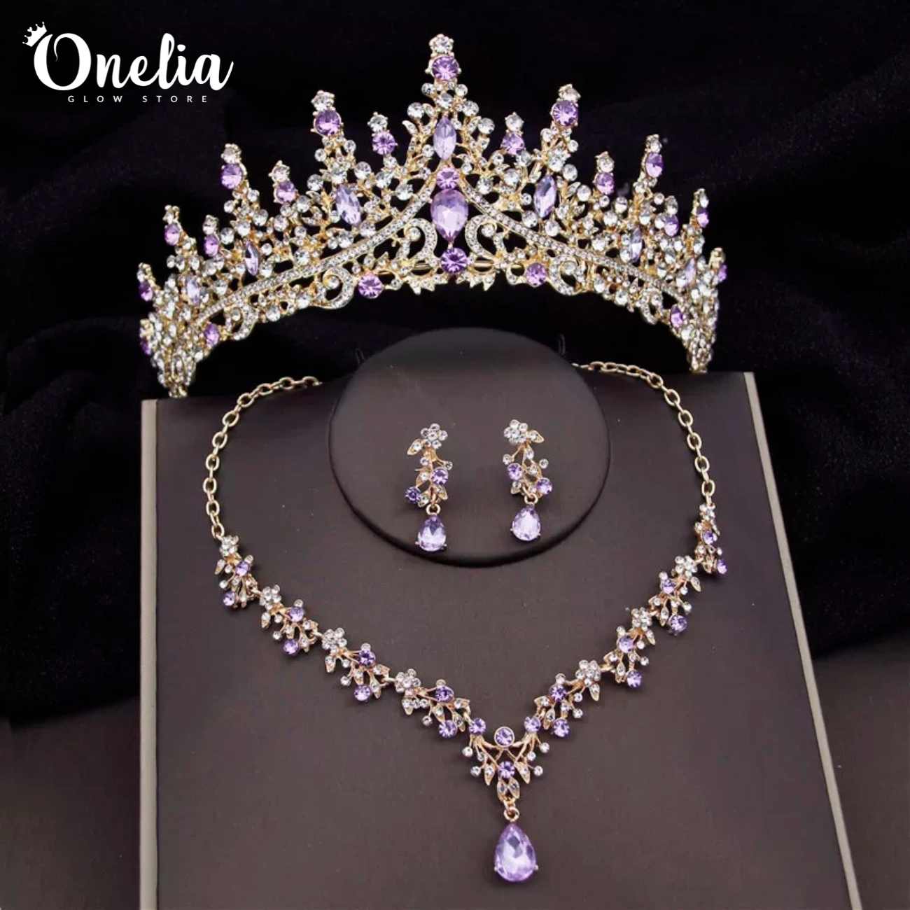 / Set tiara LETIZIA + aretes y collar LYRA – Dorado con piedras lilas – Onelia