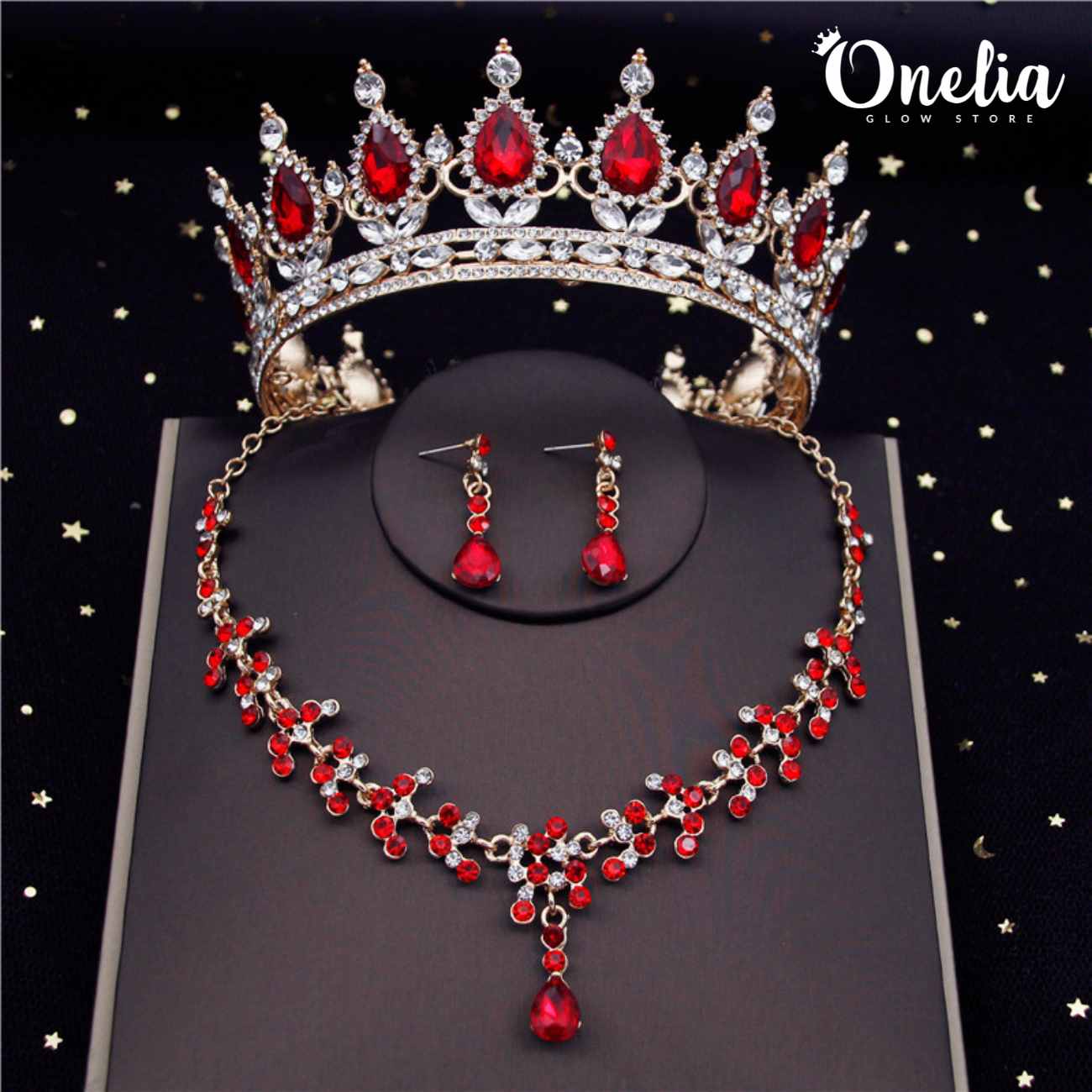 Set corona ESTEFANÍA + aretes y collar ADHARA – Dorado con piedras rojas - Onelia