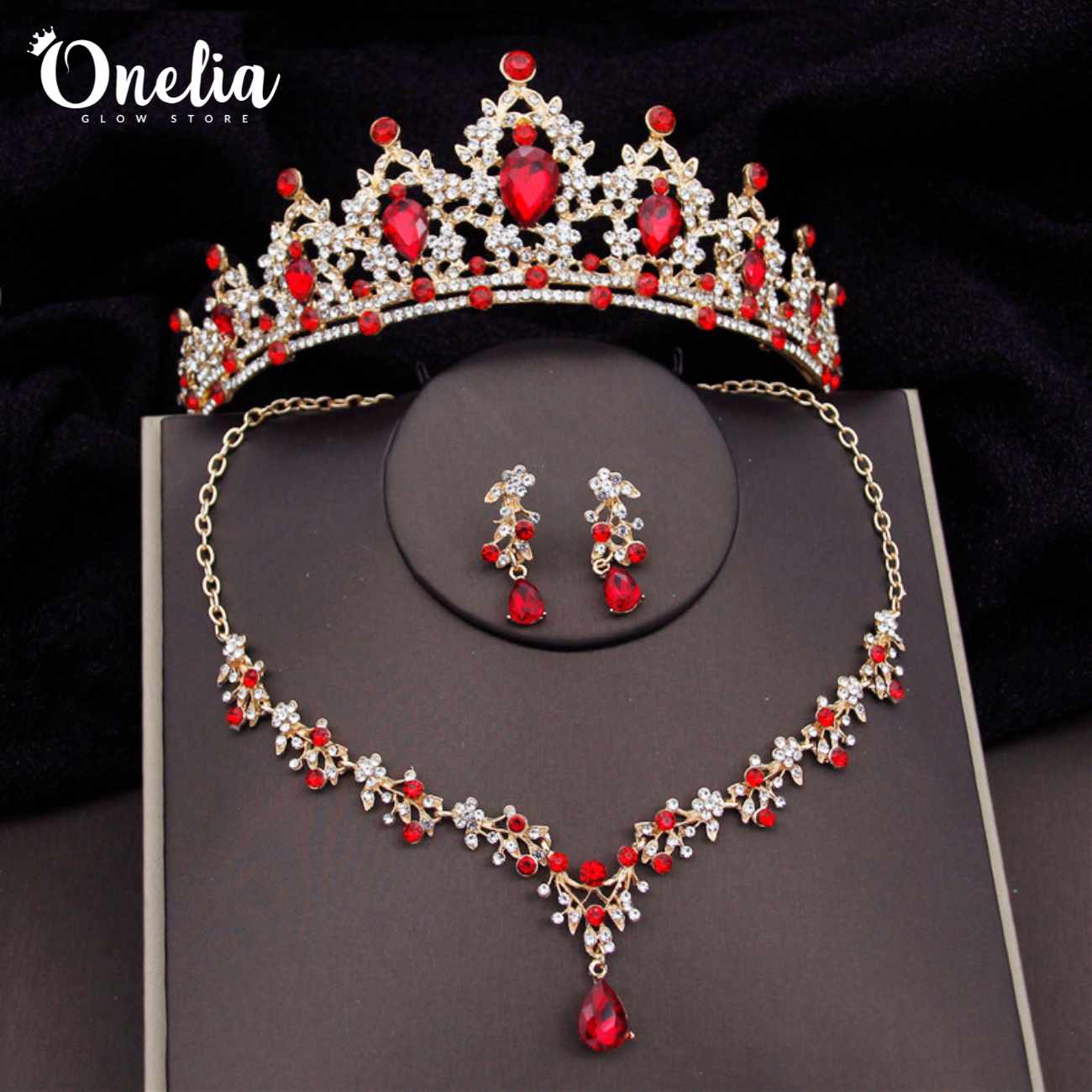 / Set tiara ASTRID + aretes y collar LYRA – Dorado con piedras rojas – Onelia