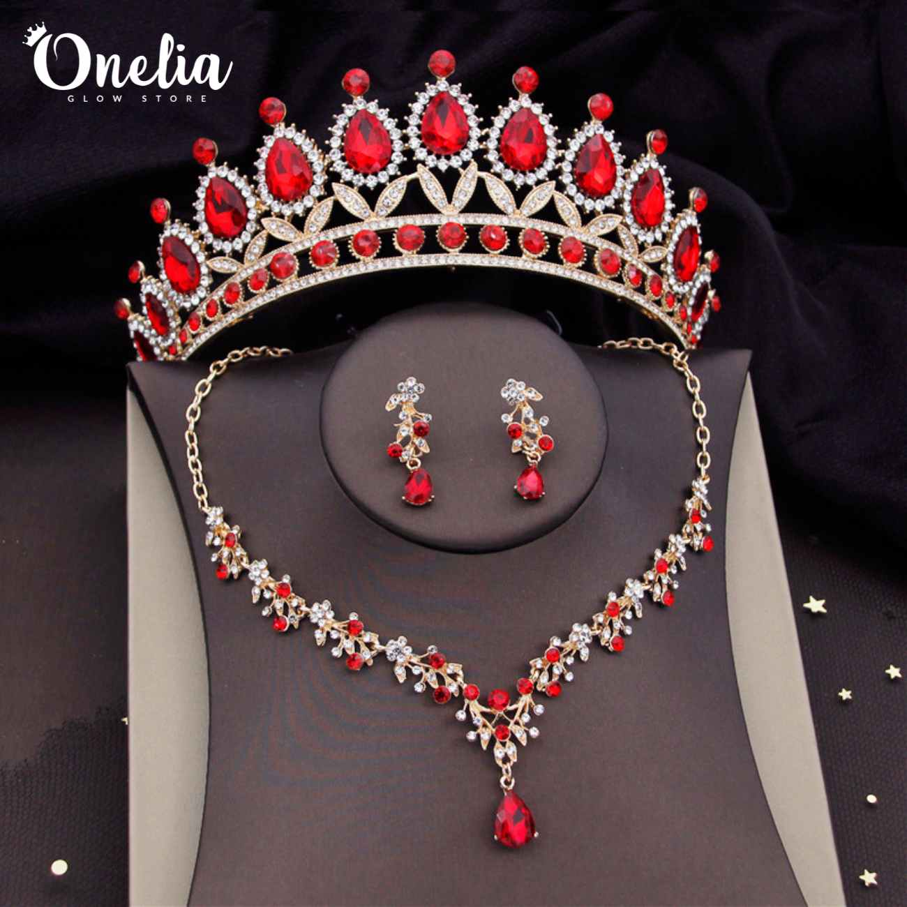 Set tiara SOFÍA + aretes y collar LYRA – Dorado con piedras rojas - Onelia