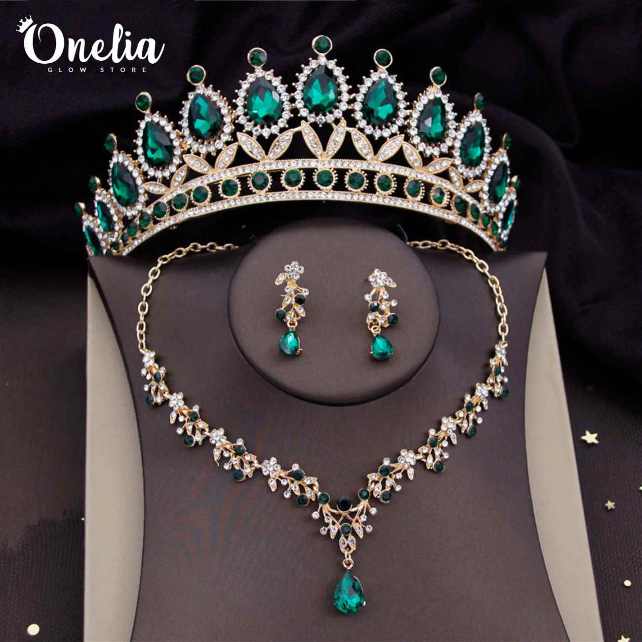 Set tiara SOFÍA + aretes y collar LYRA – Dorado con piedras verdes - Onelia