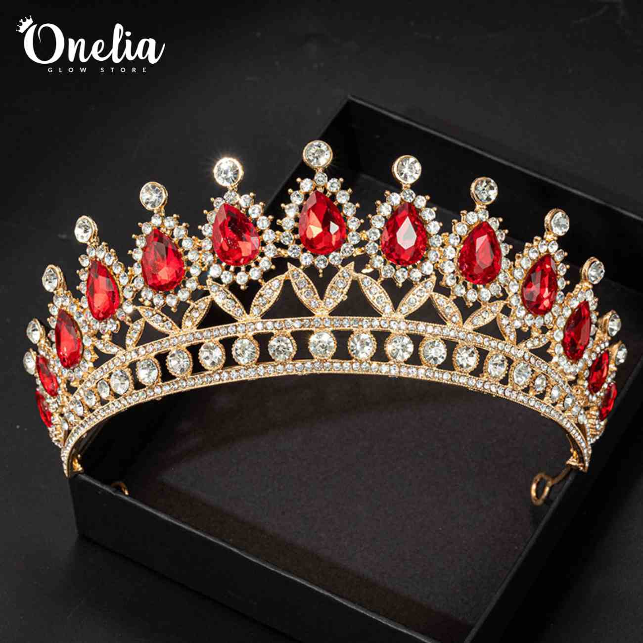 Set tiara SOFÍA + aretes y collar ROSALINDA – Dorado con piedras rojas – Onelia
