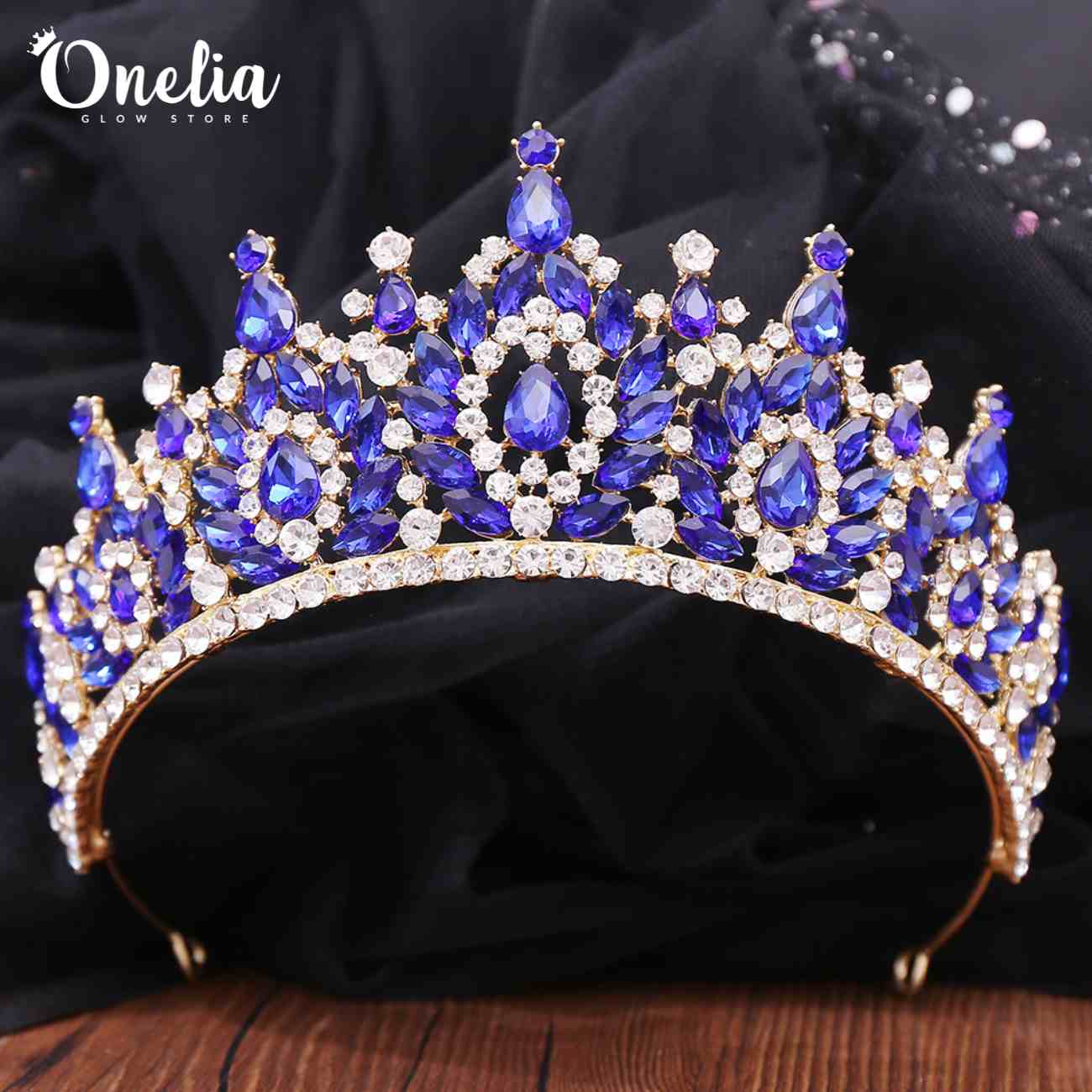ARIADNA – Tiara dorada con piedras azules 7cm alto - Onelia quantity