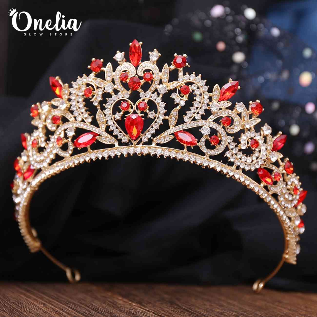 / MAGDALENA – Tiara dorada con piedras rojas 6.5cm alto – Onelia