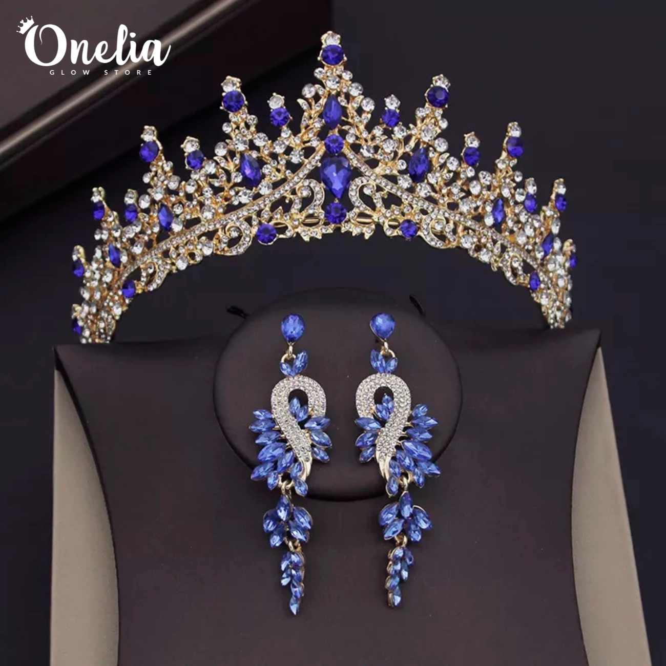 Set tiara LETIZIA + Aretes BÁRBARA – Dorado con piedras azules - Onelia quantity