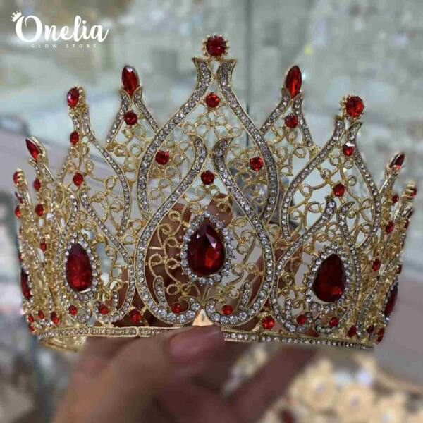 MARIANNE – Tiara dorada con piedras rojas 10.8cm alto – Onelia