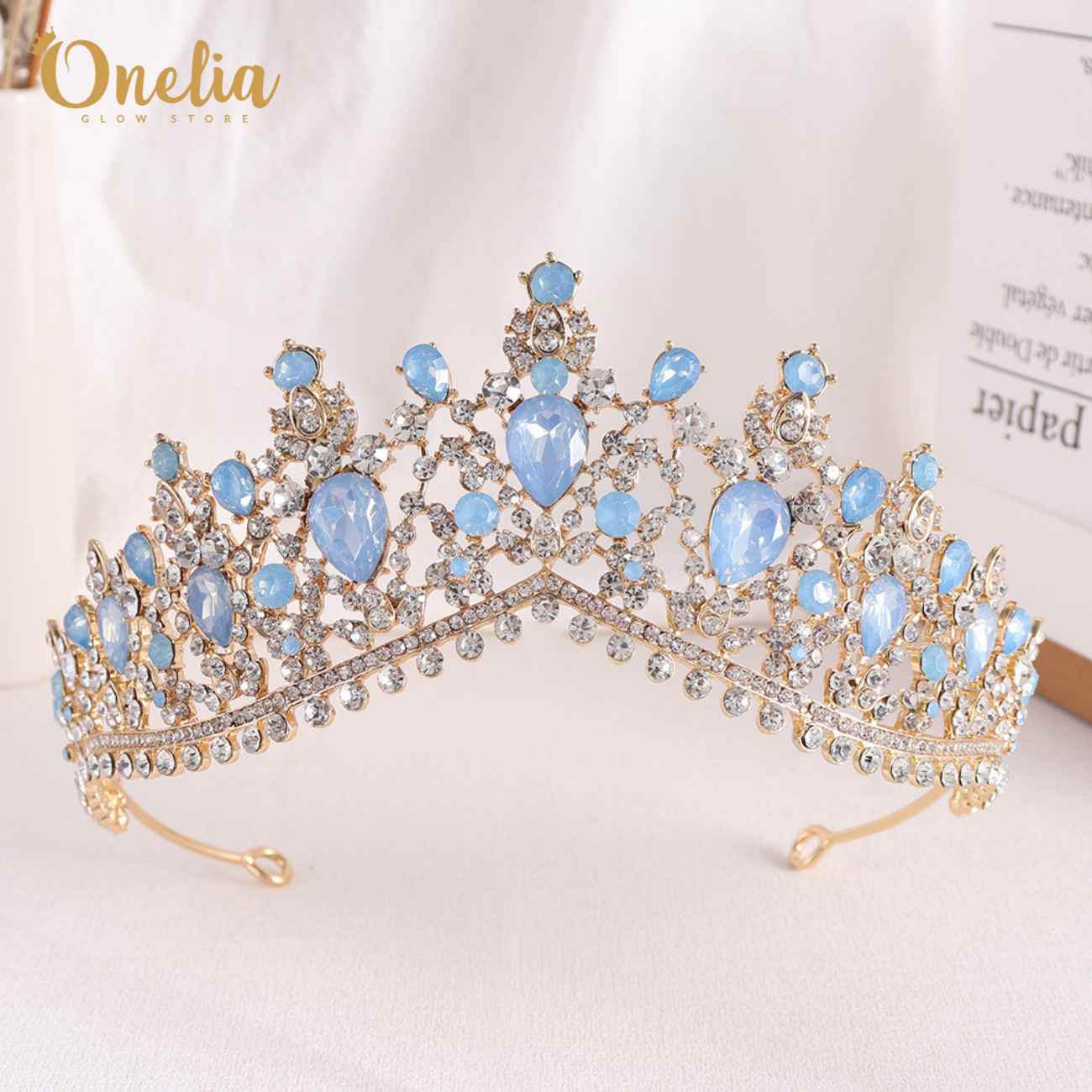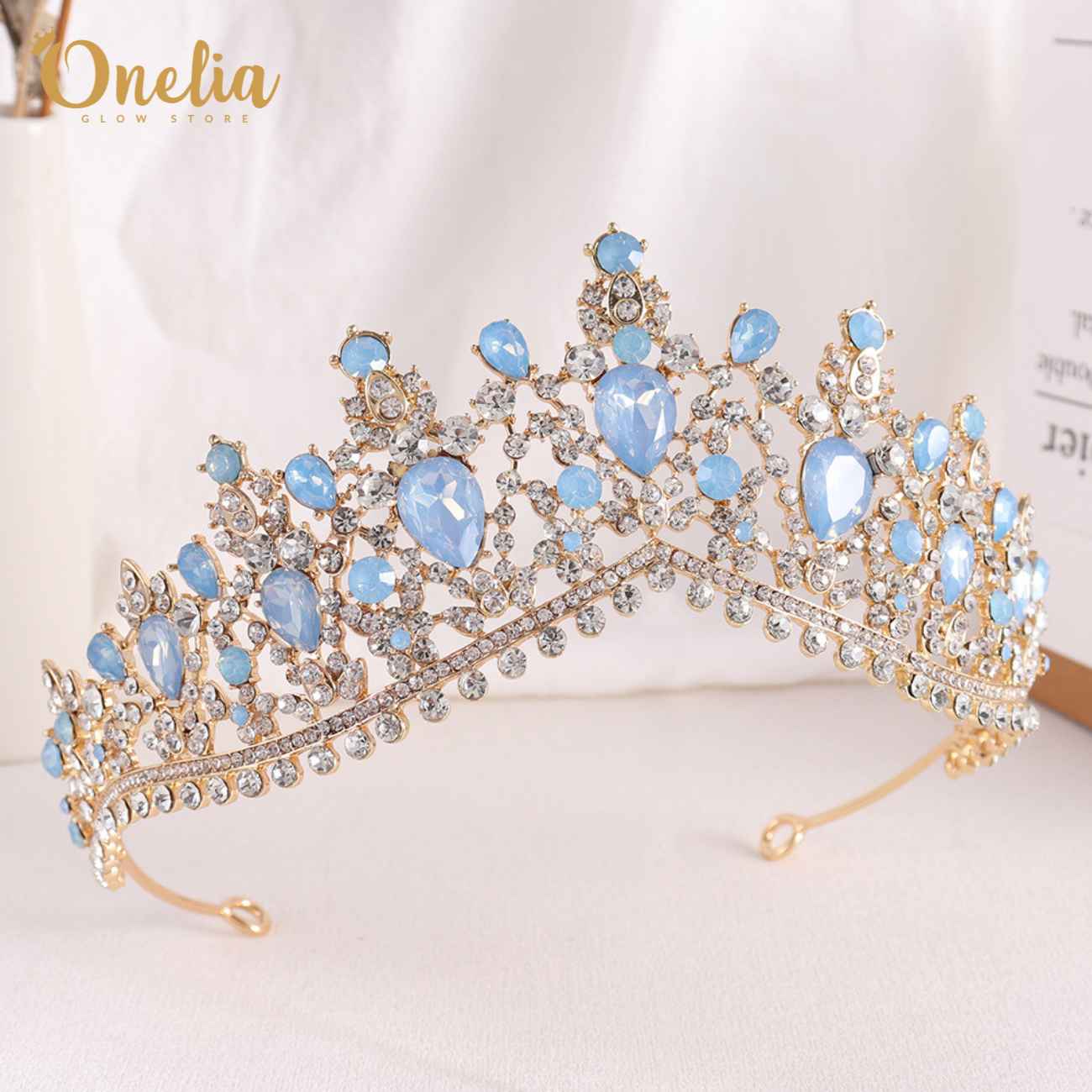 CATALINA – Tiara dorada con piedras celeste 6cm alto - Onelia