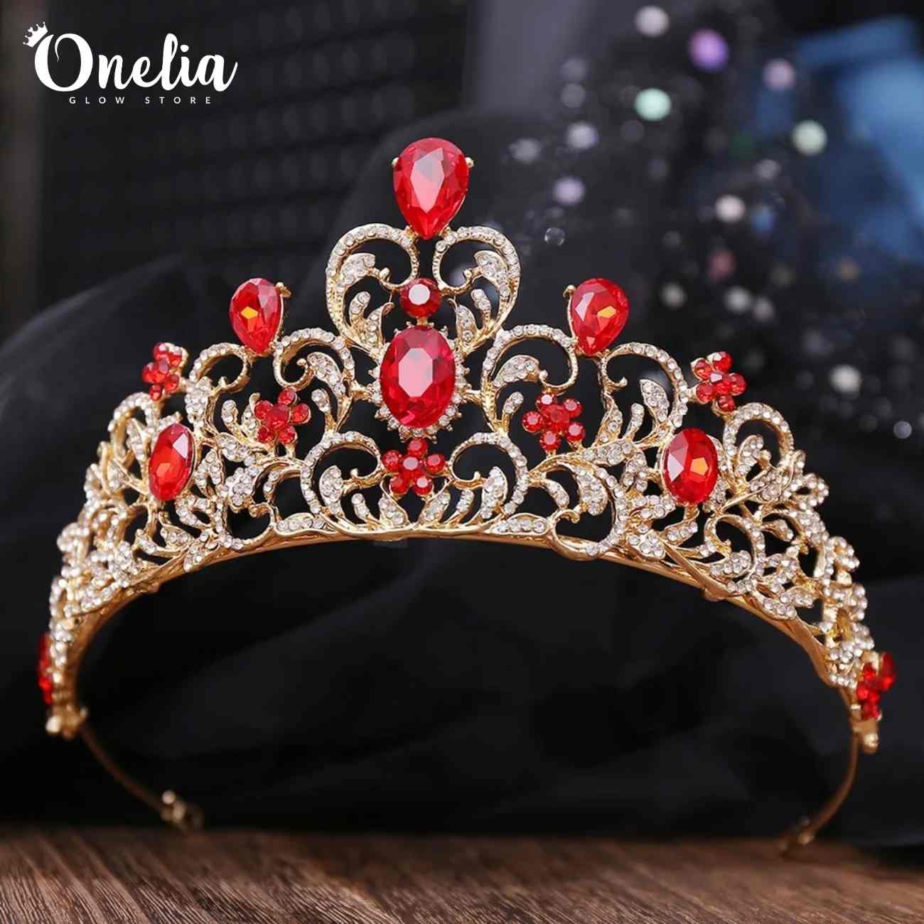 ZARA - Tiara dorada con pedrería de cristales rojos 7.1cm alto - Onelia quantity