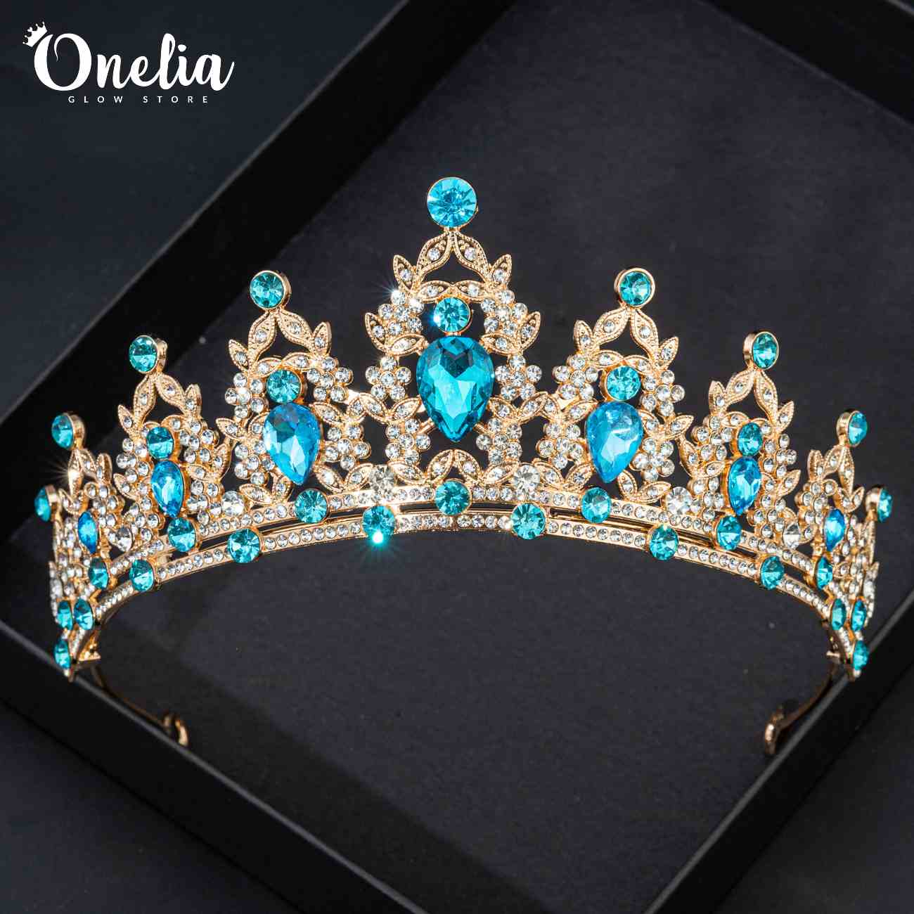 ASTRID – Tiara dorada con pedrería de cristales turquesas 5.4cm alto - Onelia